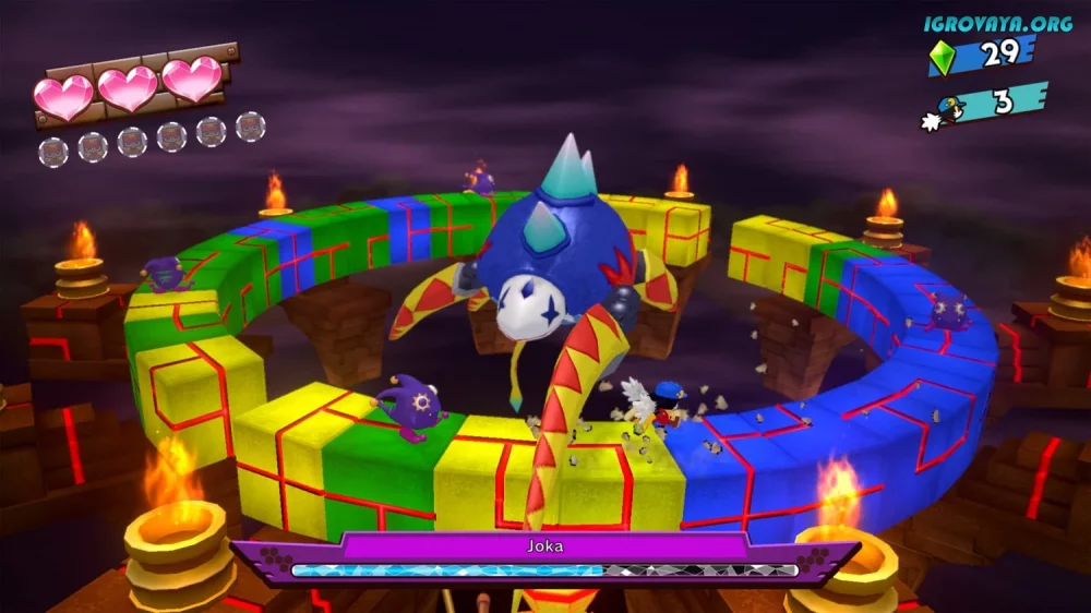 Оружие Клоноа — это большое золотое кольцо, в котором обитает его верный друг Хьюпу. С его помощью вы сможете захватывать врагов, используя их как орудия или пружины для прыжков. Будьте стратегичны и продумывайте свои действия заранее, особенно когда встретите могущественных боссов, готовых испытать ваши навыки в бою.