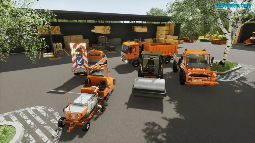 - Арсенал транспортных средств, включая бульдозеры, асфальтные катки и грузовики с платформой.