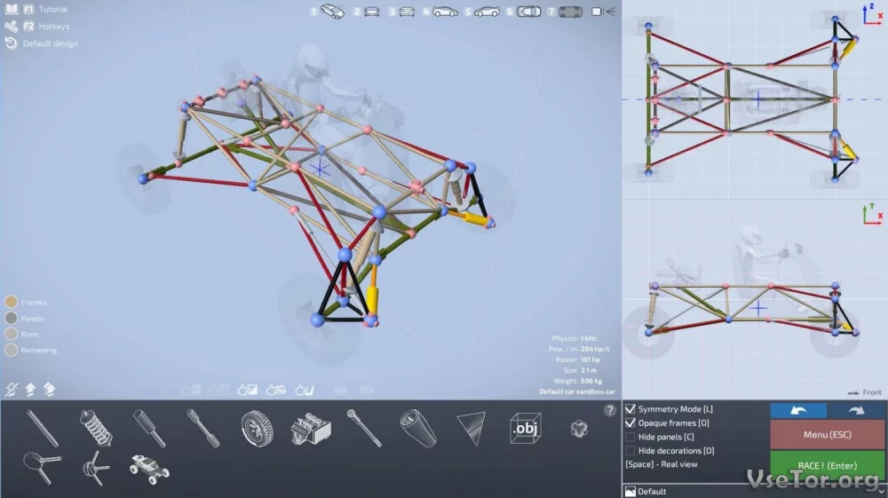 Соберите раму, выберите колеса и резину, установите двигатель и дополнительные детали, а затем отправляйтесь на тест-драйв. Проверьте автомобиль на прочность, протестируйте его на скорость, столкновения и маневренность. После удачного теста вам предстоит доделать машину, добавив обшивку, фары, бампера, спойлеры и множество других элементов.