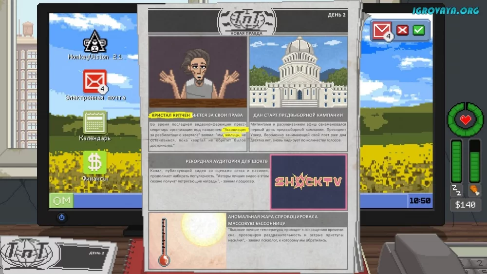 Погружаясь в игру, вы столкнетесь с различными ситуациями, которые вызовут у вас смешанные чувства. Вы увидите, как начальник, внушающий страх своим подчиненным, вдруг превращается в эксцентричного клоуна в женском платье. Или как уборщица, при виде своего начальника, начинает активно собирать компромат на него для дальнейшей продажи.