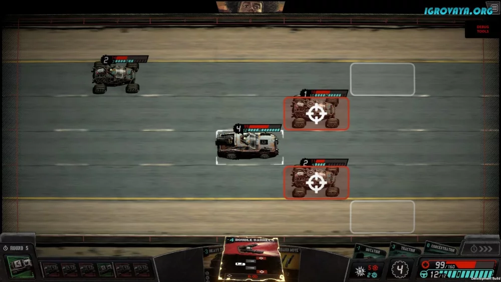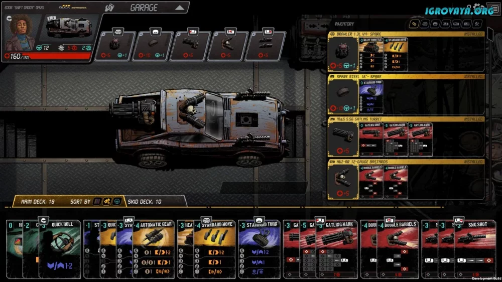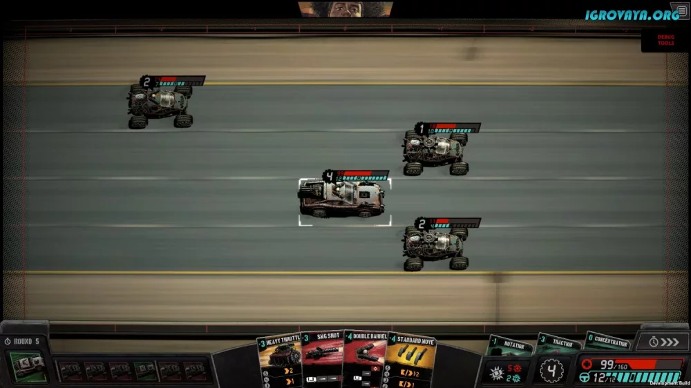 Создавайте колоду из карт, чтобы улучшить свой автомобиль. Используйте детали, которые вы получите после победы над соперниками. Устанавливайте опасное оружие, меняйте запчасти и создавайте уникальные комбинации для победы в гонке.
