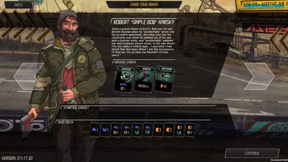 Вам предстоит принять участие в этой экстремальной гонке и бороться за лучшее будущее. Выберите своего водителя и машину из представленного списка, внимательно изучите их характеристики, так как они будут влиять на ваш результат в гонке. После выбора спонсора отправляйтесь в захватывающее приключение.