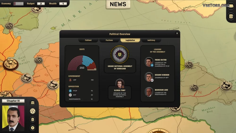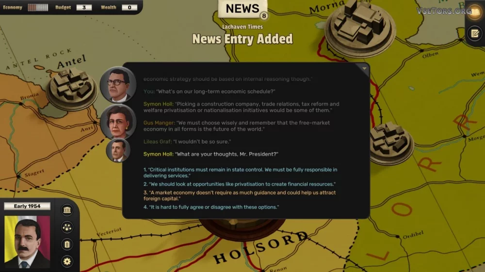 Помимо этого, игра требует от вас анализировать новости и делать выводы о ситуации в стране и среди ее населения. Вы будете сталкиваться с конкурентами, готовить свою страну к передаче власти следующему правителю и принимать множество других ответственных решений. Возможные последствия ваших действий могут быть не всегда благоприятными, и вам предстоит принимать их во внимание при принятии каждого шага в игре.