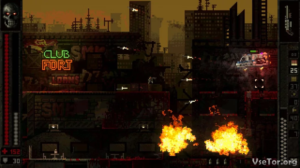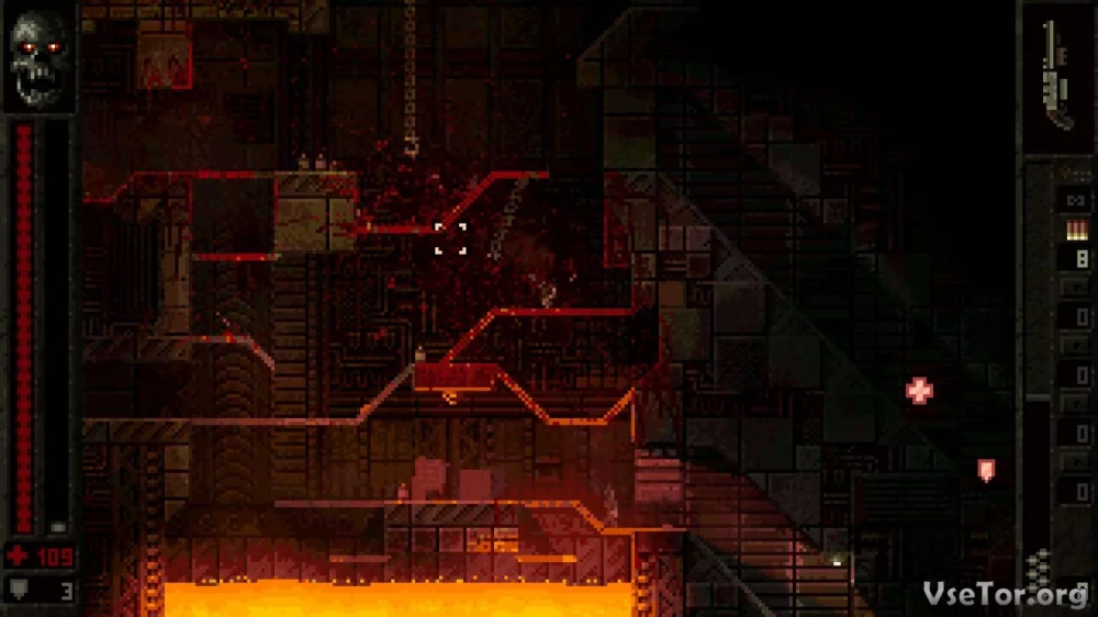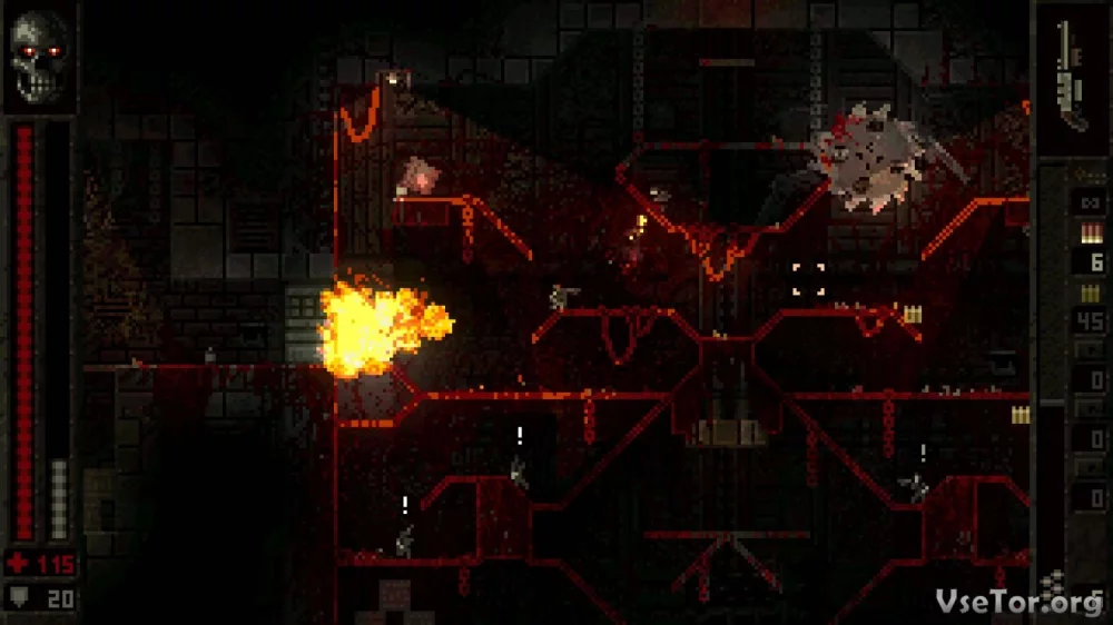 Игровой процесс в Butcher несложен, но захватывающ. Вы будете преодолевать различные препятствия, сражаться с врагами и использовать разнообразное вооружение. Каждый уровень преподносит новые испытания, будь то падающая циркуляционная пила или внезапно схлопывающиеся стены комнаты.