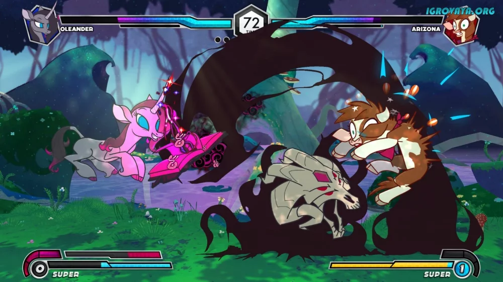 Them's Fightin' Herds предлагает уникальный подход к жанру файтингов, привнося свежесть и оригинальность за счет персонажей - единорогов, пони, альпак, лонгмов, коров и северных оленей. Каждый из них обладает своими способностями и стилем боя, что делает игру уникальной и захватывающей.