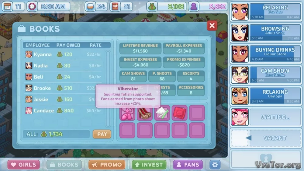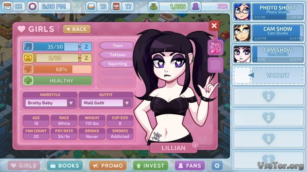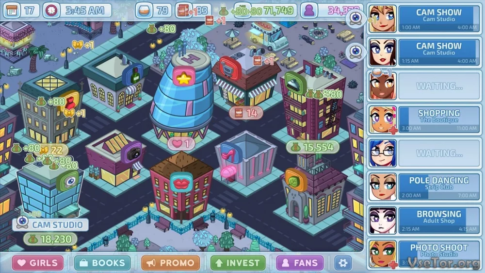 - Развитие студии и заработок зависят от 18 уникальных девушек, предоставляющих разные услуги.