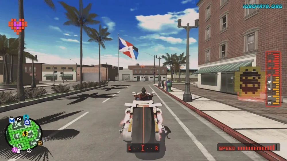 - Исследуйте огромный город на своем мощном байке или пешком, встречая рандомные события и открывая дополнительный контент.