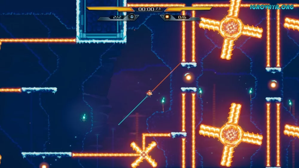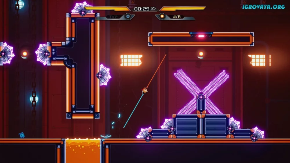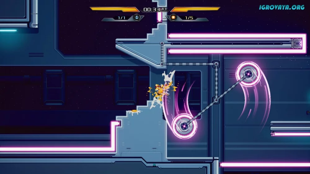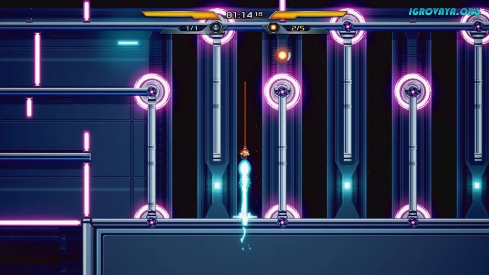 - Освойте новое и необычное управление - ваш главный герой обладает двумя лучами, синим и оранжевым. Синий позволяет вам отталкиваться от стен и увеличивать скорость, в то время как оранжевый предназначен для притягивания к стенам.