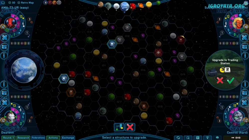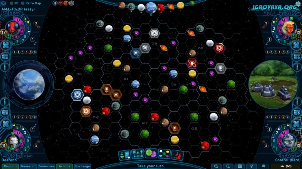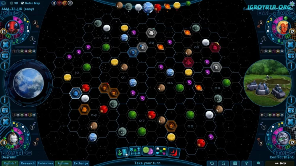 - Стратегическое мышление: разработайте свою стратегию колонизации и двигайтесь к победе шаг за шагом, учитывая особенности вашей фракции.