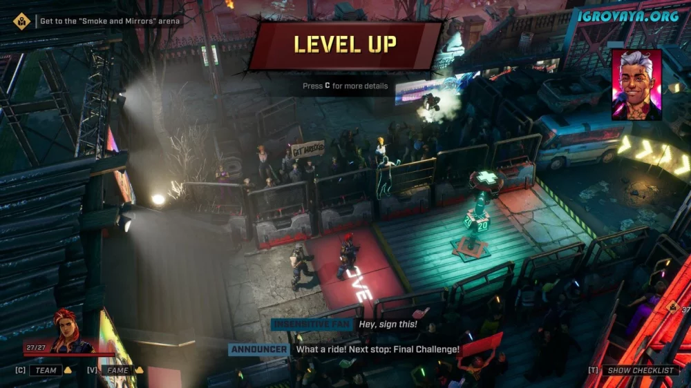 Боевая система игры уникальна благодаря многочисленным ловушкам на поле боя и ведущему реалити-шоу. Ваши решения влияют на отношение ведущего, что заставляет вас действовать хитро и стратегически. Зарабатывайте очки признания от зрителей, чтобы привлечь спонсоров и получить преимущество в виде передового оружия и экипировки.