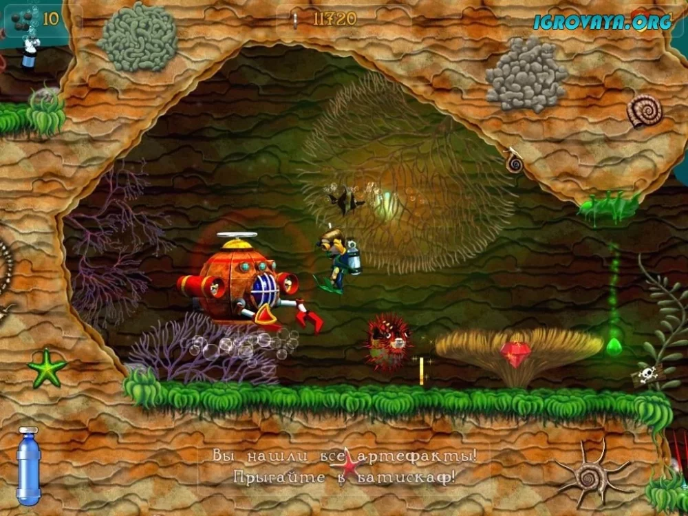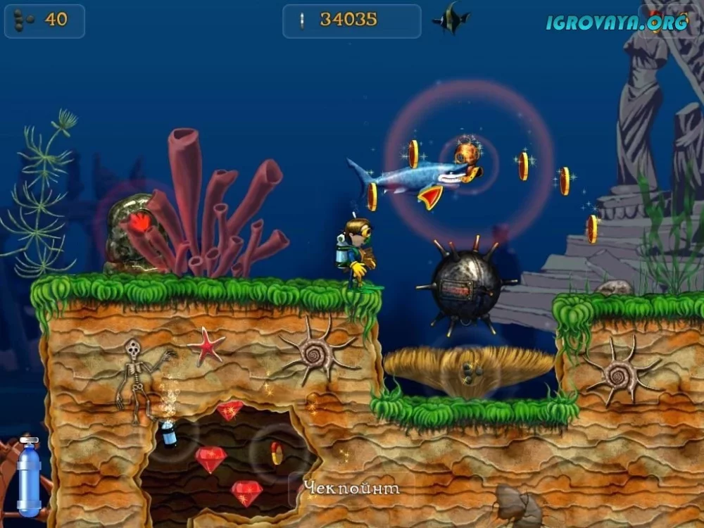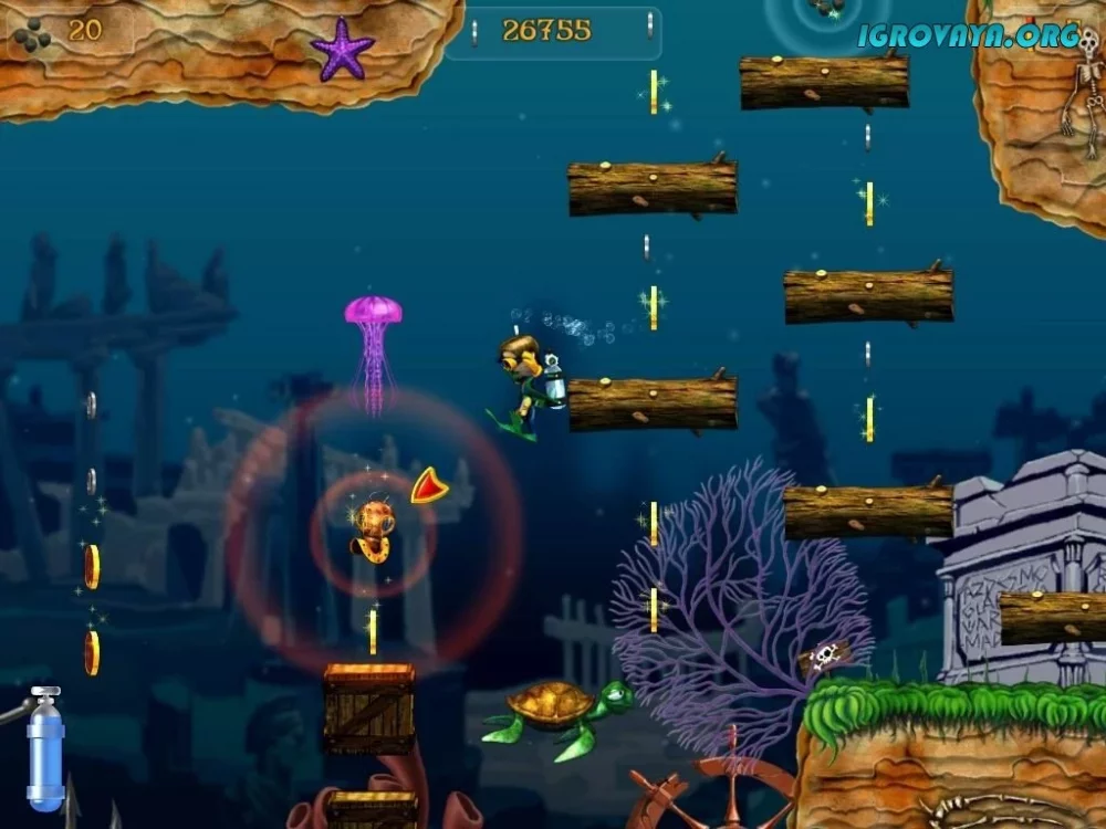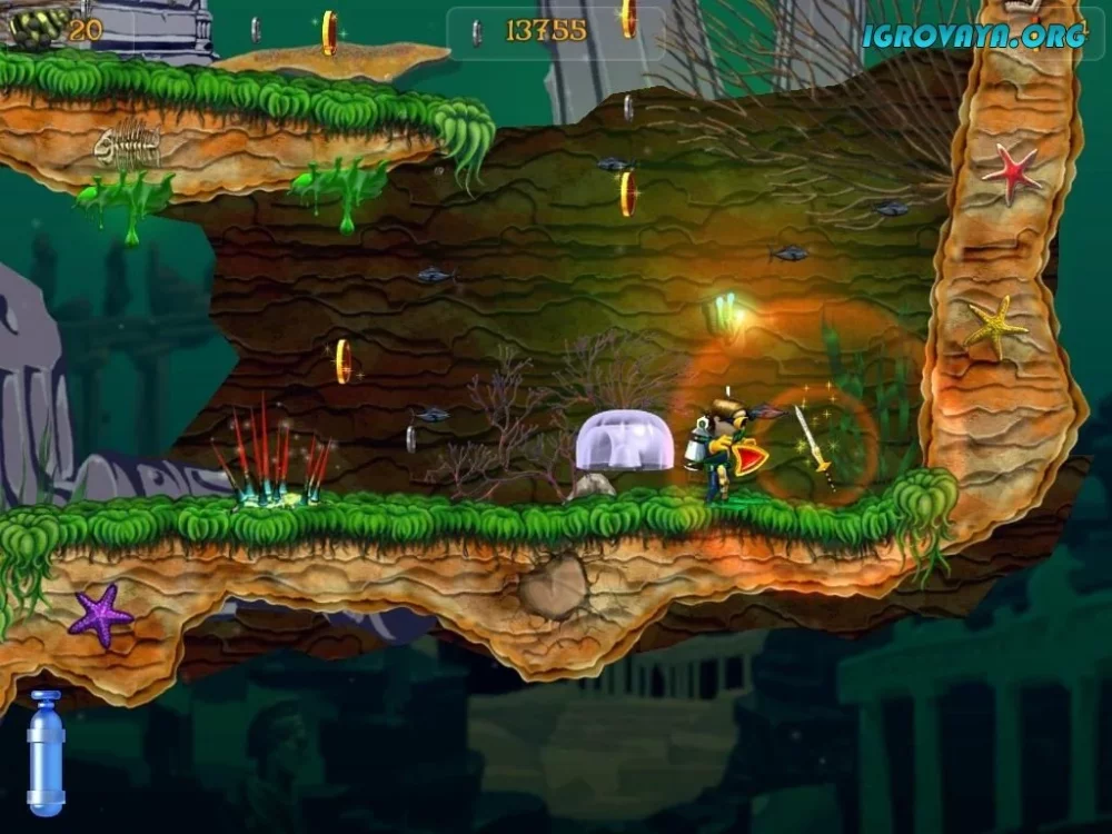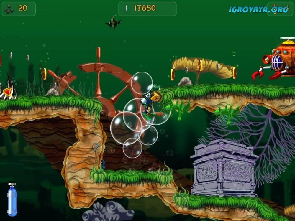 Погрузитесь в захватывающий мир подводных глубин в платформере, который заставит вас пройти через удивительные приключения. Встречайте необычных обитателей морских глубин и исследуйте загадочные места в поисках сокровищ. Вам предстоит примерить на себя роль отважного аквалангиста по имени Кенни, который отправился на поиски частей загадочного артефакта, оставленного ему в наследство дедушкой.