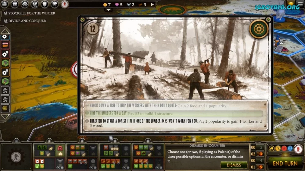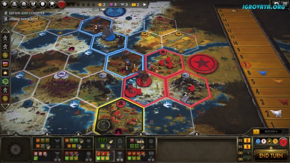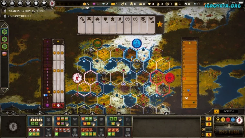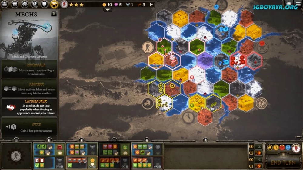 Игровой процесс Scythe включает в себя элементы развития, добычи ресурсов и создания армии. Начните со своей фракции и базовым запасом ресурсов, чтобы покорить этот альтернативный мир.