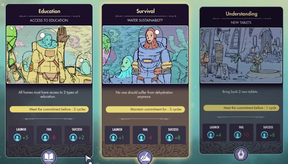 - В игре есть механика исследования, которая поможет открывать новые технологии и ресурсы для борьбы с вызовами.