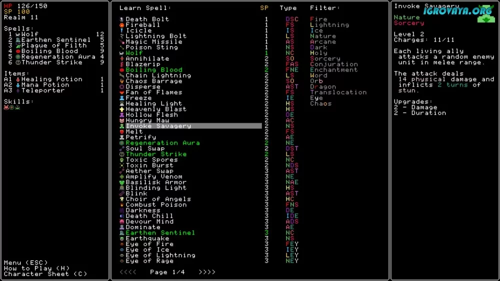 - Прохождение уровней, открывание новых умений и заклинаний.