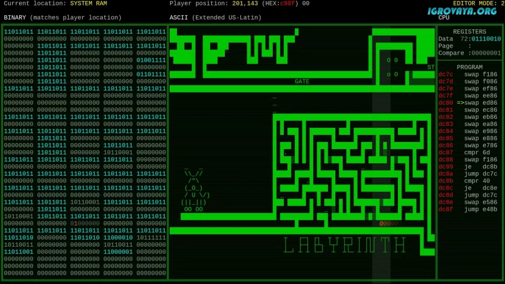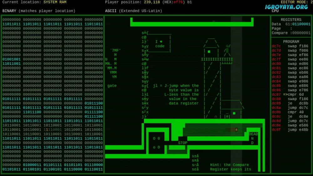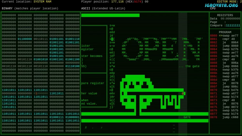 Игровой процесс основан на решении различных головоломок, требующих креативного подхода и понимания программирования. Отыщите уязвимости в коде, исследуйте работу центрального процессора и оперативной памяти, взломайте машинный язык и помогите биту найти путь к свободе.