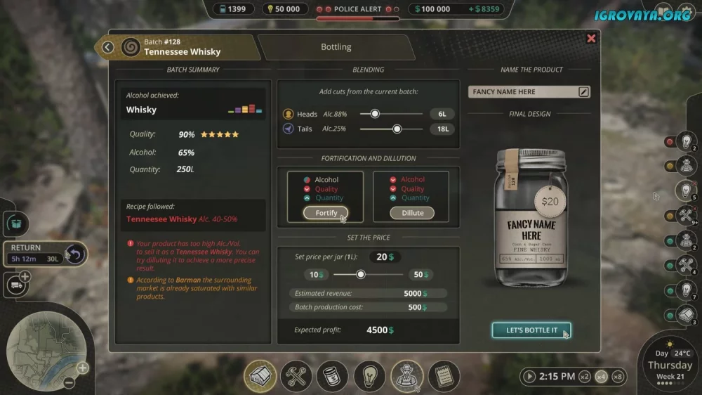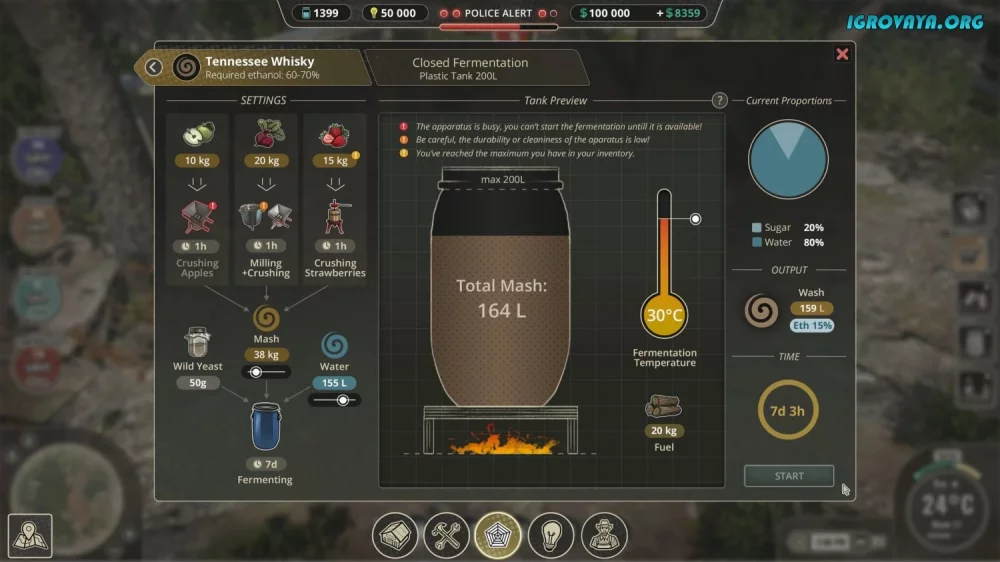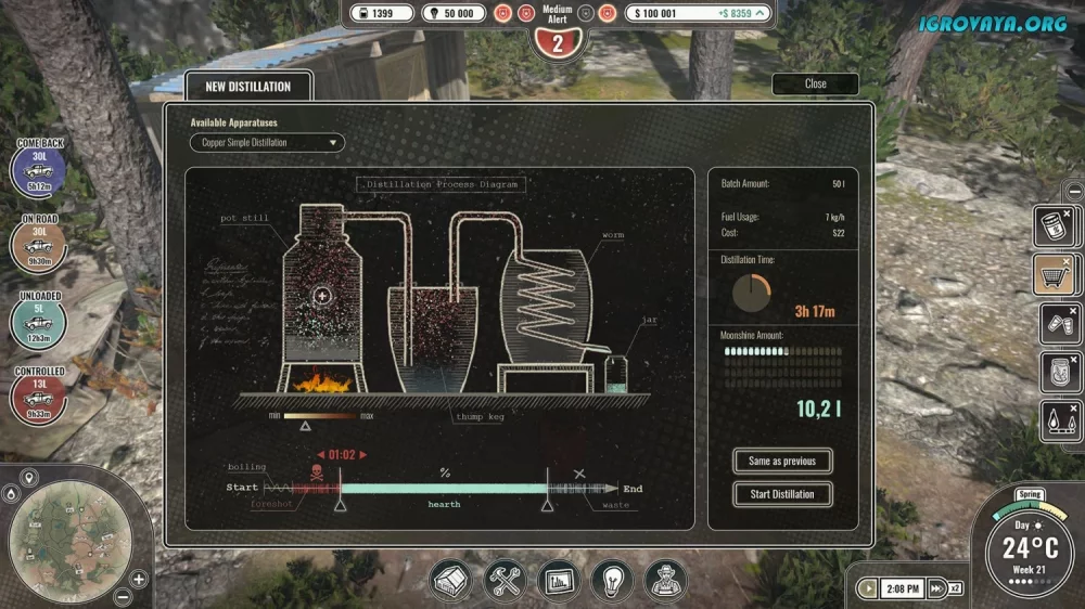 Погрузитесь в захватывающий мир самогоноварения, став самогонщиком, который оказался в долгах перед мафией, и начните играть в увлекательную игру под названием Moonshine Inc. Отправляйтесь в путь создания собственной самогонной империи, производите огромные объемы самогонного спирта, развивайтесь, зарабатывайте деньги, выплачивайте долги и удовлетворяйте жажду людей вкусным самогоном.