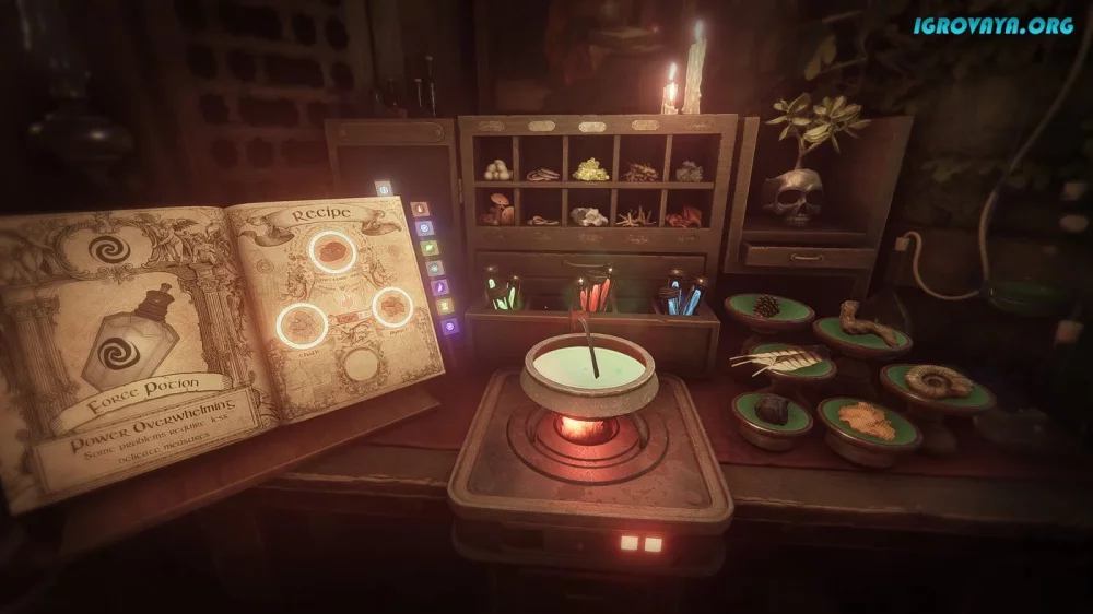 - Решайте головоломки, взаимодействуя с различными предметами, находя рецепты и создавая зелья, которые помогут вам преодолеть все препятствия на пути к спасению учителя.