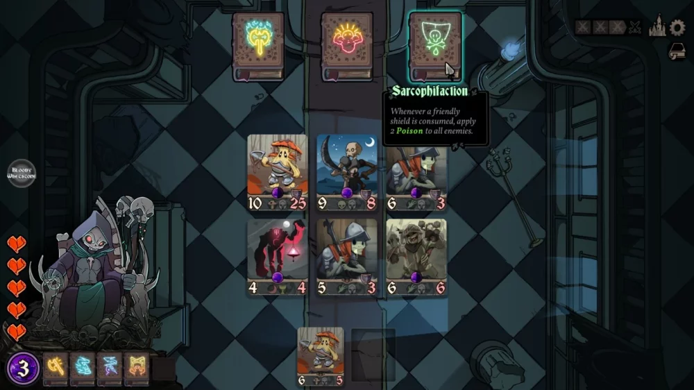 Ваш замок станет местом, где вы сможете отдохнуть, подготовиться к новым испытаниям и улучшить свои навыки. Случайно сгенерированные события обеспечат вам постоянное разнообразие и вызовы, не давая вам скучать ни на минуту. Узнайте, какие комбинации карт и героев подойдут именно вам, и создайте свой неповторимый стиль игры, который поможет вам завоевать Костяной Трон.