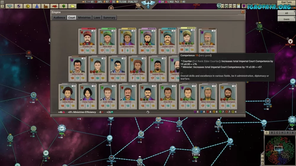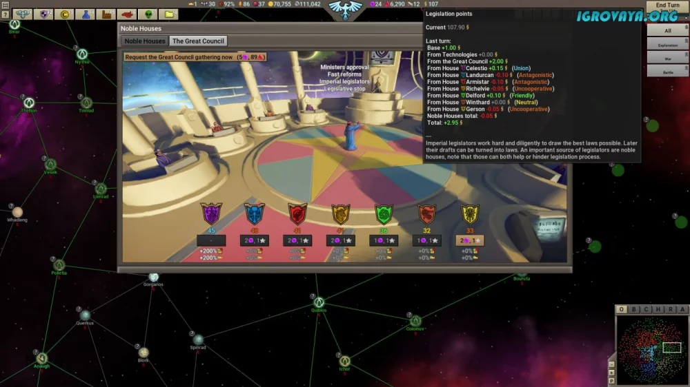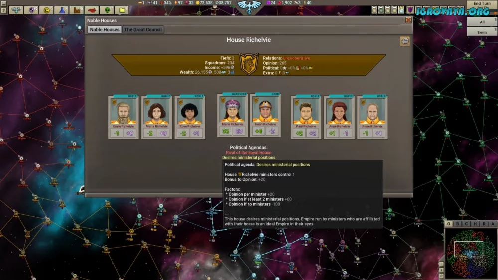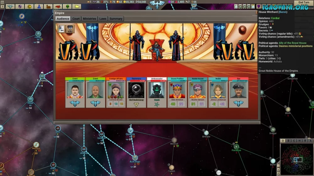 - Завоюйте космос, управляя баронами и герцогами, поддерживая отношения с дворянскими домами и предотвращая бунты и заговоры.