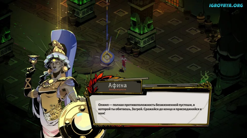 Протагонист игры, Загрей, стремится достичь вершин Олимпа, но для этого ему нужно пройти через тартар, асфодел и элизиум, где его ждут скелеты, ведьмы, горгоны и другие монстры. Благодаря помощи богов, таких как Зевс, Нептун, Афродита и Дионис, Загрей обретает силу и способности для тяжелого пути из подземного мира. Игра глубоко уважает древнегреческую мифологию, давая игрокам возможность полностью погрузиться в атмосферу произведения.