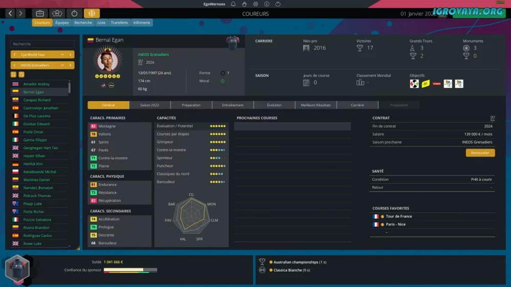 Погрузитесь в увлекательный мир велоспорта с игрой Pro Cycling Manager 2022. Станьте спортивным директором велокоманды, исследуйте потенциал молодых талантов, собирайте идеальные команды и доведите их до победы в самых престижных соревнованиях. Планируйте тренировочные программы, изучайте календарь гонок и продемонстрируйте свои лидерские навыки, чтобы заработать репутацию и прибыль.