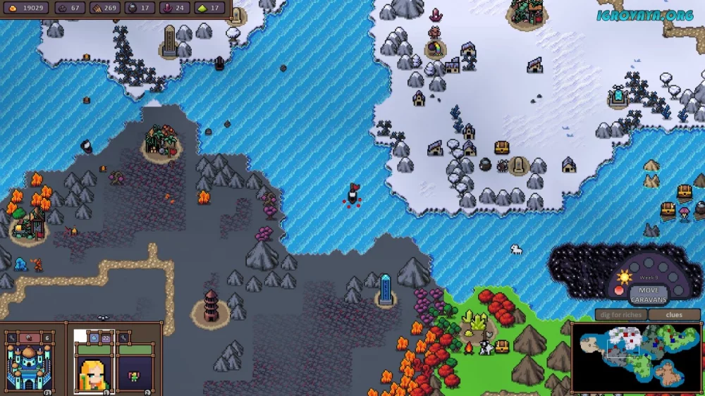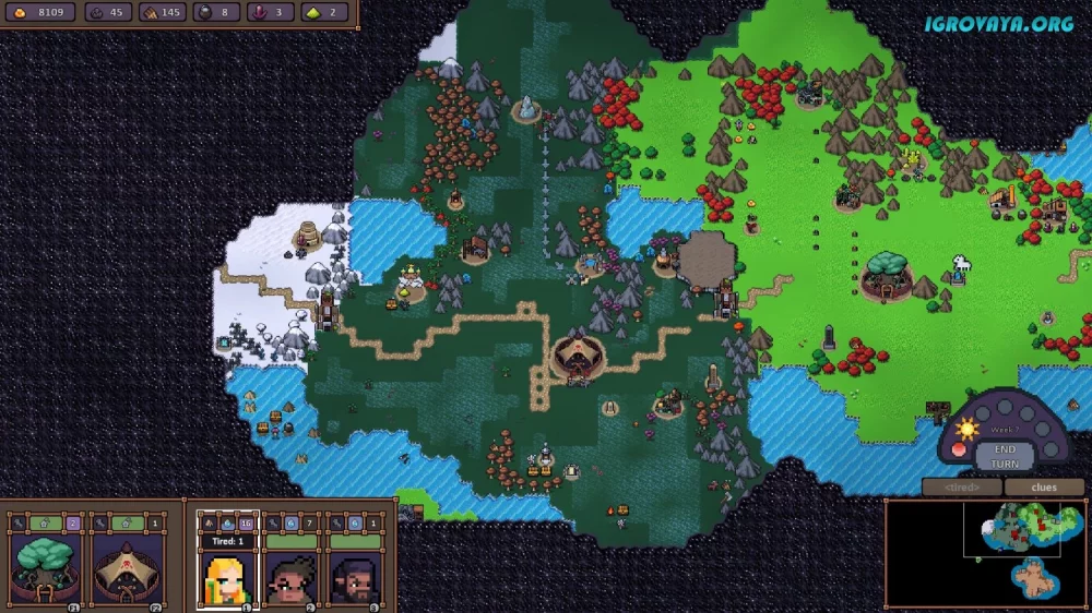 - Сбор ресурсов, найм воинов, поиск артефактов и выполнение заданий.