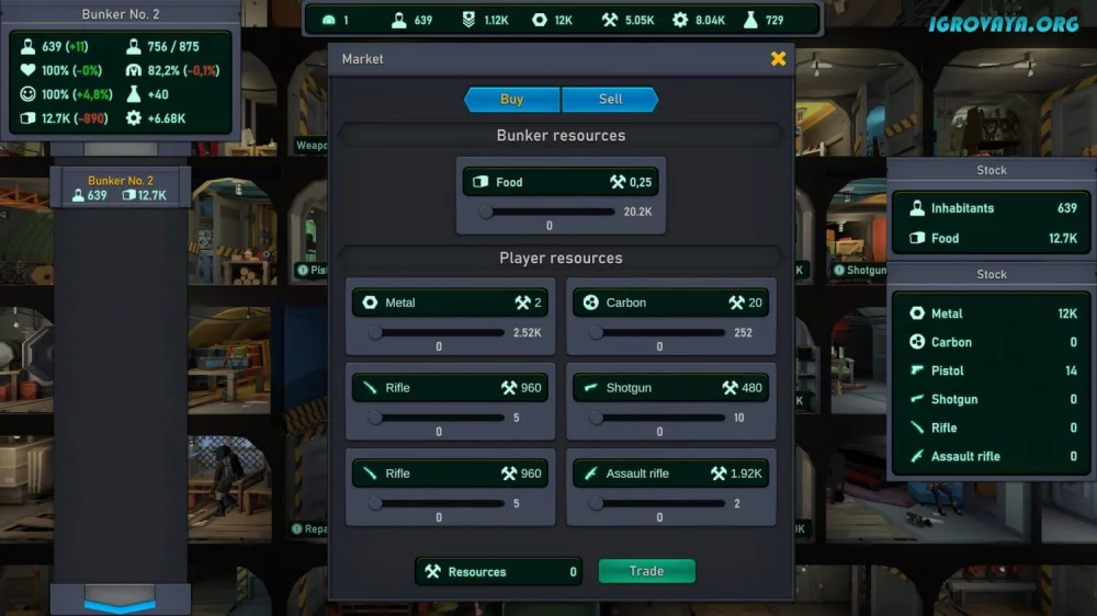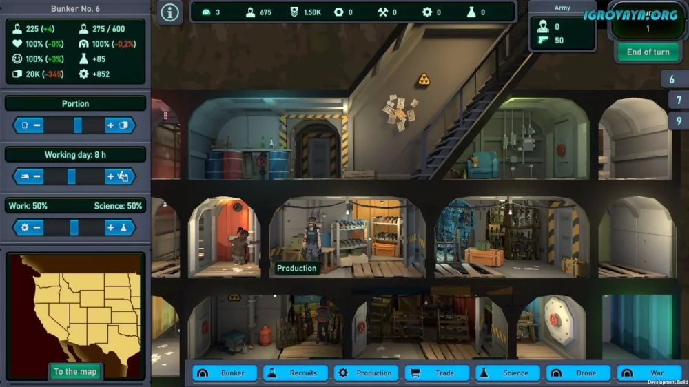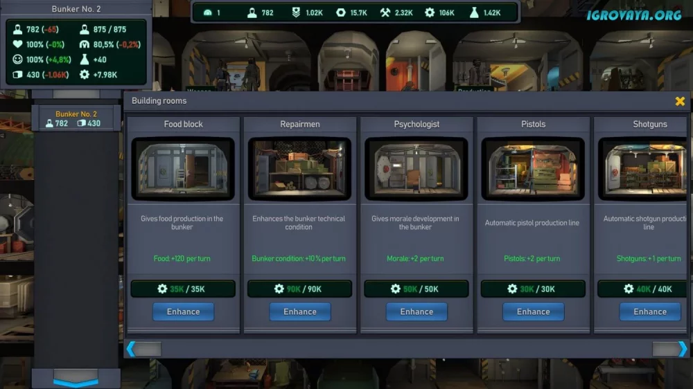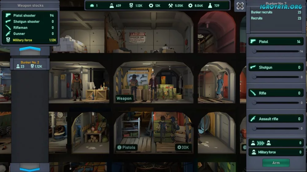 - Развивайте бункер, строите новые здания, добывайте ресурсы и принимайте новых выживших;