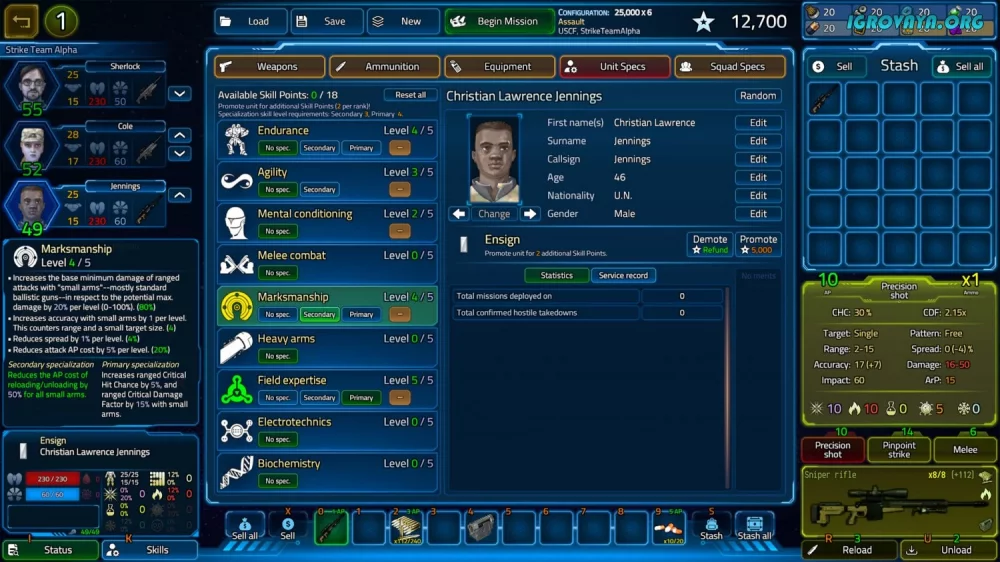 - Прокачивайте и снаряжайте своих бойцов, выбирая для них оружие и умения.