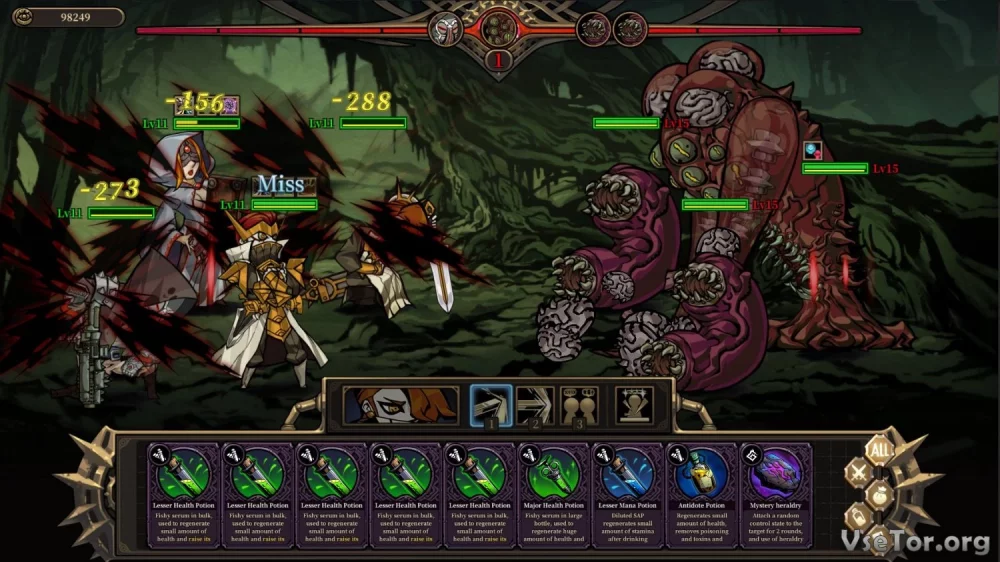 - Геймплей разделен на тактические пошаговые сражения с монстрами, исследование окружающего мира и ролевую составляющую с прокачкой героев и наемом новых бойцов.