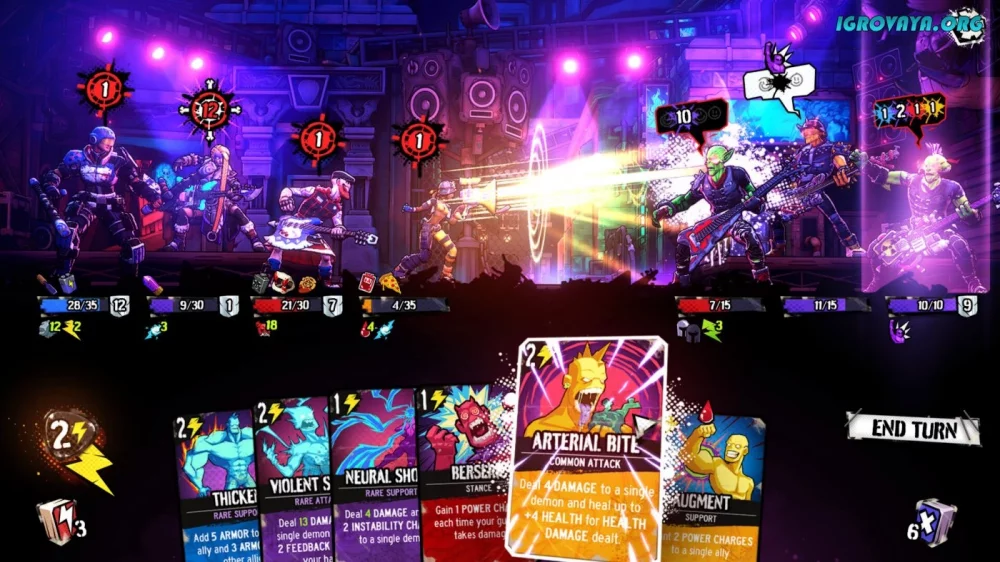 Power Chord приглашает вас окунуться в динамичный игровой мир, где ваша стратегия играет ключевую роль. Необходимо продумывать не только свои тактики в сражениях, но и выбирать верный путь на карте, который может преподнести как сокровища, так и сильных противников.