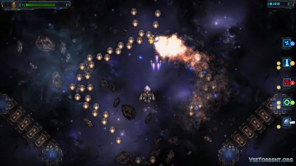 Игровой процесс в целом достаточно прост. Вам нужно управлять кораблем, вооруженным передовыми технологиями, и уничтожать противников. Прорывайтесь через орды противников, используйте все доступные средства, выживайте и сражайтесь с боссами, чтобы покинуть базу живым и невредимым.