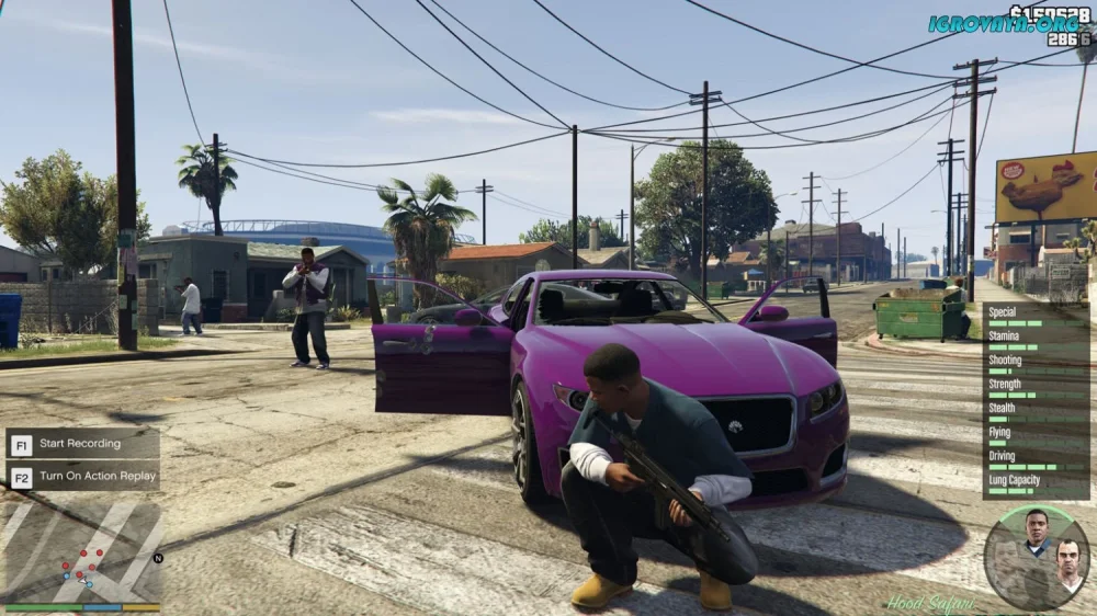 Grand Theft Auto 5 — это невероятный симулятор открытого мира, который погружает вас в атмосферу солнечного Лос-Сантоса. Этот мегаполис, напоминающий Лос-Анджелес, поражает своей контрастностью: роскошь и преступность идут здесь рука об руку. Мир игры масштабен и разнообразен — от живописных сельских местностей до шумных городских улиц. Разработчики уделили внимание каждой детали, что делает игру незабываемой на максимальных настройках графики.