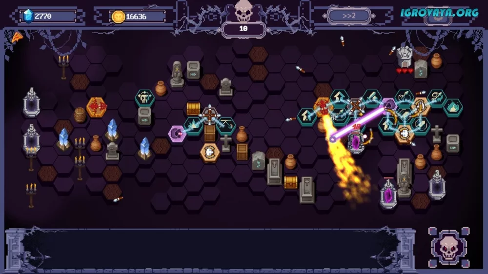 Поле боя поделено на множество шестиугольных ячеек, каждая из которых может быть занята вашими постройками. На них также располагаются разрушаемые элементы декора, а вражеские существа передвигаются по ним. Порталы на карте выделяются, и именно оттуда появляются монстры. Огонь, летящий из порталов к вашей крепости, показывает движение врага, помогая вам строить оборону эффективно.