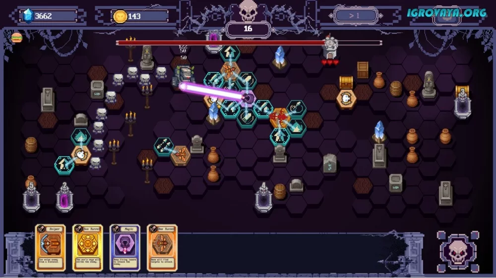 Игроку предстоит последовательно проходить усложняющиеся уровни. Перед началом игры геймер соберет себе колоду максимум из 4 карт со зданиями, преимущественно турелями с различными видами атак. В начале игры доступна лишь небольшая часть построек, остальные можно открыть, успешно проходя миссии. Загрузить Hexagonal Tower через торрент можно на нашем сайте, чтобы испытать себя в обороне крепости.