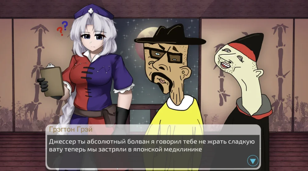 Юмор тут - главная фишка, шутки летят непрерывно, пародируя фан-культуру Touhou, штампы визуальных новелл и саму тему "героя из другого мира". Местами игра неожиданно цепляет за живое, особенно через нового персонажа Каккои, которая, несмотря на мафиозную тему и абсурд, ощущается как настоящий житель Генсокё. Музыка получилась мощной и запоминающейся, с отсылками к оригинальным трекам, но со своим характером.