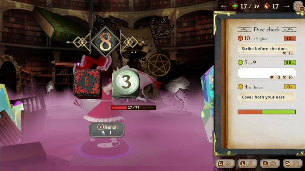 Геймплей построен как настоящая ролевая сессия: вы управляете Рейму, принимаете решения, кидаете кубики и исследуете локации, стилизованные под старинный фолиант. Каждый бросок определяет исход событий, особенно в боях, где стратегия зависит от результата. В игре несколько типов d6: одни дают только четные числа, другие выпадают нулями или высокими значениями, третьи показывают вопросительные знаки вместо цифр. Нужно использовать их с умом - специальные кубики ломаются после нескольких применений. Есть CP-очки для переброса неудачных результатов, но они ограничены. Советы Ремилии, Фландре, Сакуи и Патчоули не просто болтовня - они влияют на развитие персонажа. За каждую помощь получаете очки влияния, а при повышении уровня выбираете награду: новые кубики, характеристики или способности.