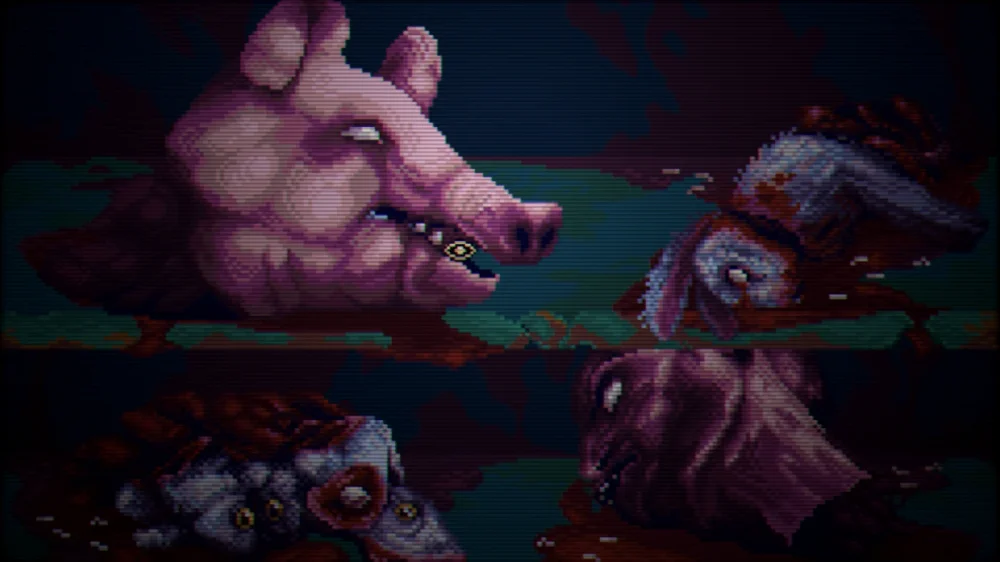 - Атмосфера 16-битного хоррора с CRT-фильтром в стиле VHS-кассет