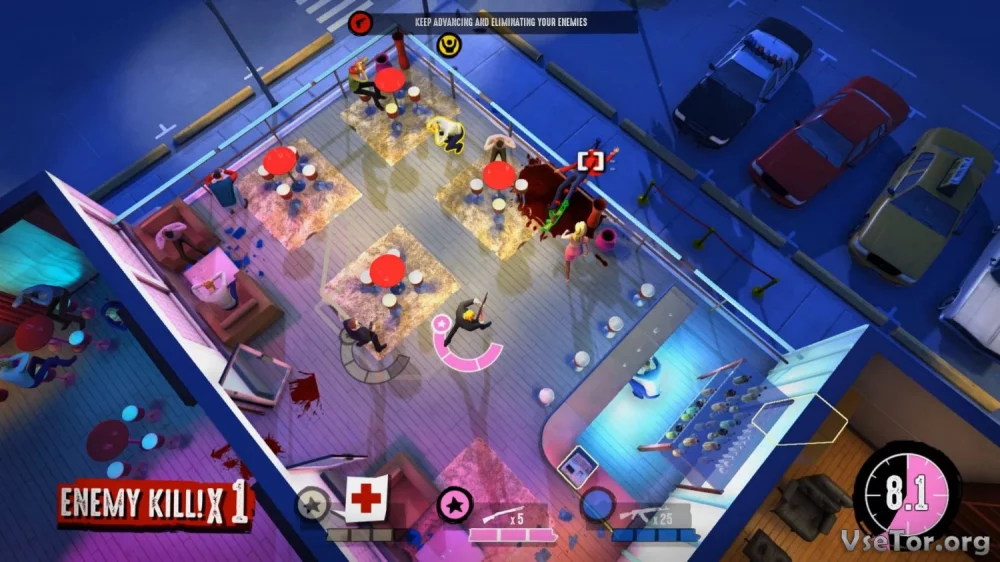 - Шутер с видом сверху дополняется элементами стратегии и развития персонажей.
