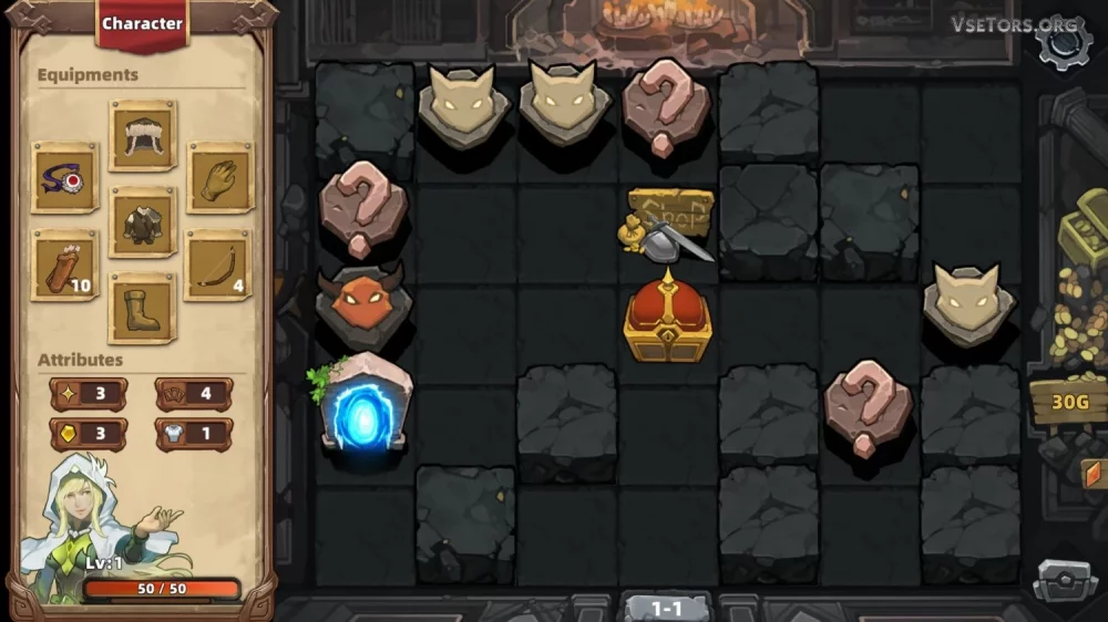- Почти две сотни карточек снаряжения, влияющих на характеристики героя.