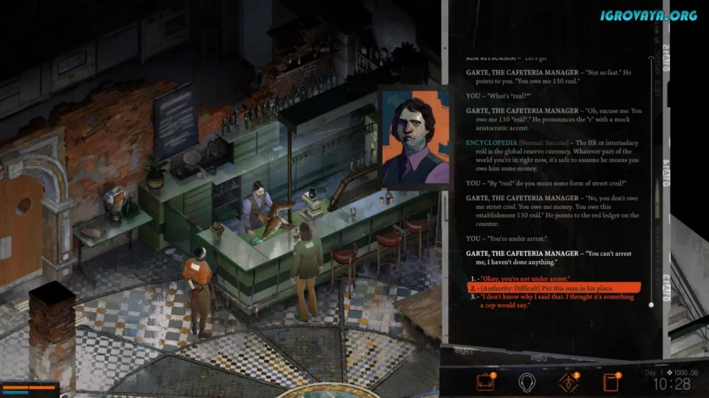 Игровой процесс в Disco Elysium предлагает разнообразные механики и задания, от расследований до сражений. Вы сможете выбирать, как взаимодействовать с персонажами – давить на них, дружить, обманывать или пугать. Ваши решения и действия будут влиять на развитие сюжета и исход игры. И не забывайте, что вас ждут драки, которые можно избежать, если найдется лучшее решение.