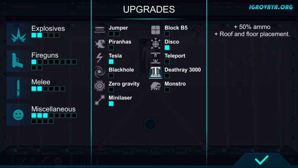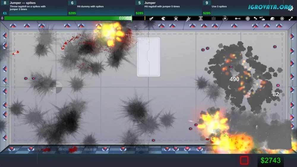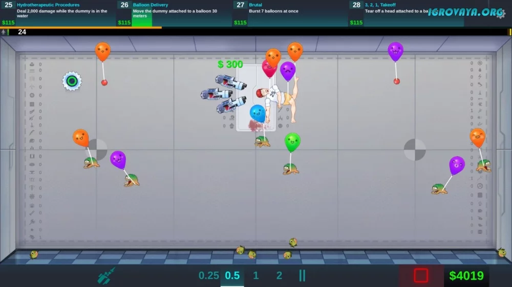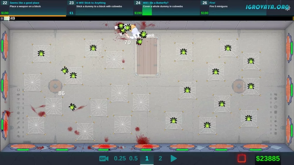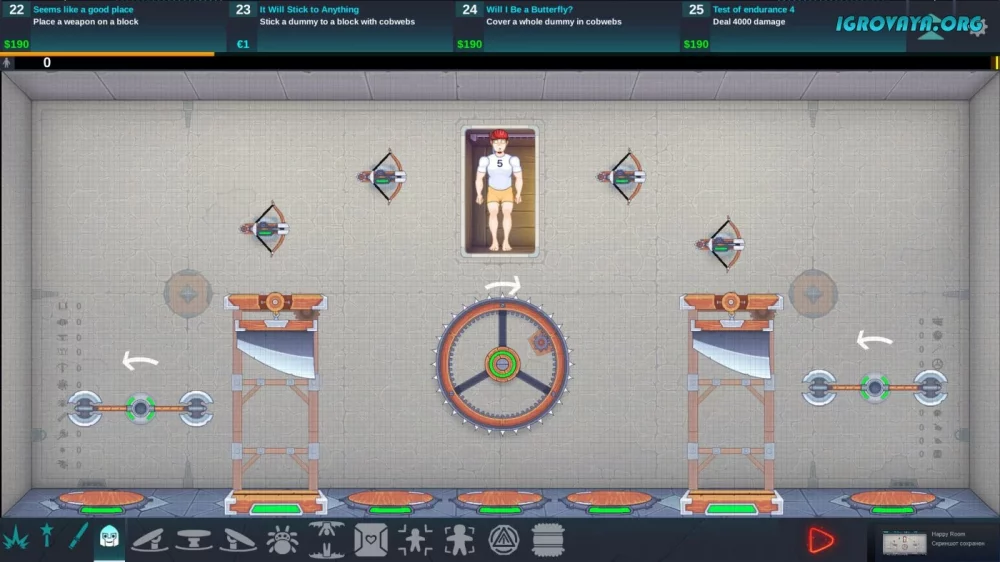 Убить в Happy Room можно по-разному – сотнями и тысячами способов. В начале вам доступны только базовые виды оружия: биты, копья, мечи, лезвия и многое другое. С их помощью вы сможете создавать циркуляционные пилы, ловушки с шипами, бьющие клона-человека, и многое другое. Чем эффектнее смерть клона, тем больше очков вы заработаете за его уничтожение. Очки можно использовать для покупки нового оружия, гаджетов и ловушек.