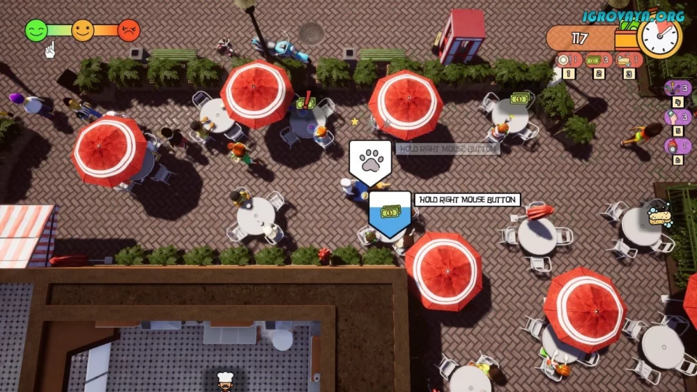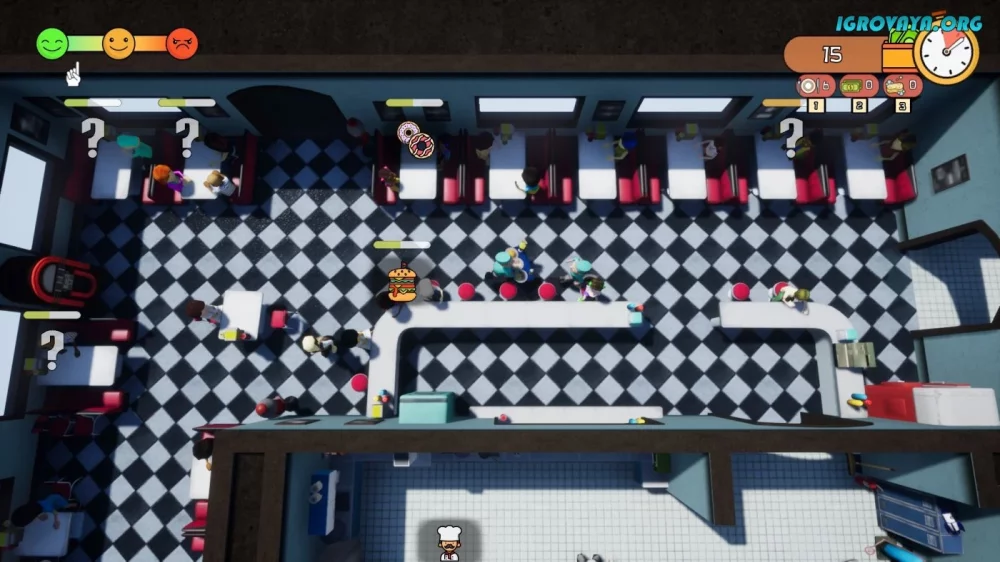 Приготовьтесь к тому, что работа в ресторане не так проста, как кажется. Вам придется быть внимательным, быстрым и решительным, чтобы успешно выполнять все задания. Следите за порядком, угадывайте желания посетителей и не забывайте про VIP-места — ведь от них зависит ваш заработок.