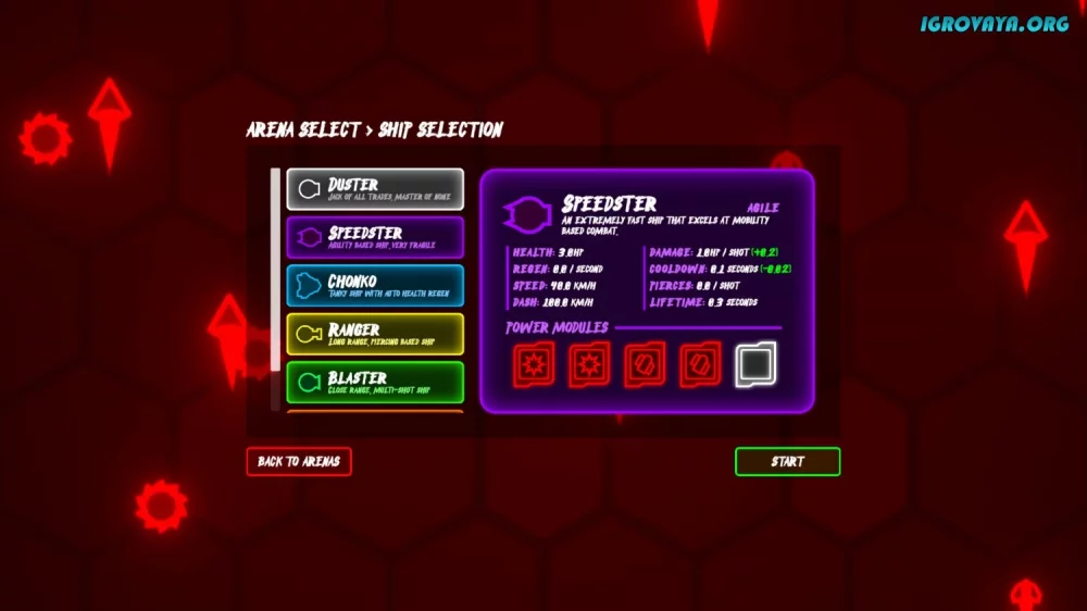 Игра предлагает различные арены с уникальным визуальным оформлением и разнообразными противниками. Вы можете настраивать сложность игры, изменяя количество врагов. Теперь действие переносится на ваш боевой корабль. Изучите его характеристики: скорость, атаки, и возможности улучшения. В начале вам доступны всего три корабля, но по мере прохождения уровней вы сможете разблокировать десятки новых моделей.