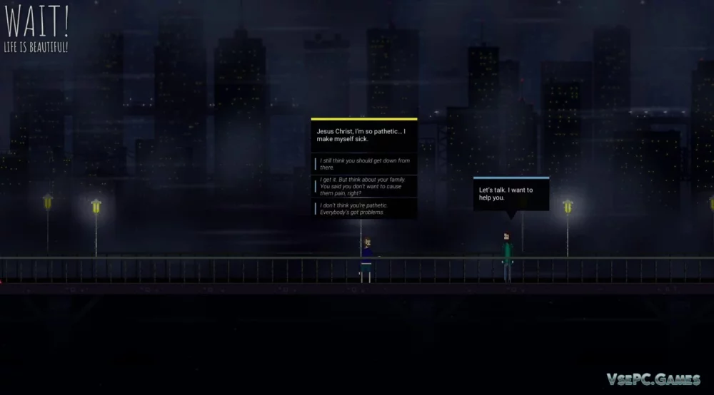 Что заставляет человека совершить самоубийство? Как можно помочь ему изменить свое решение? Вопросы, на которые вам придется найти ответы, играя в "Wait! Life is Beautiful!". Ваши действия и слова могут спасти или погубить чью-то жизнь, и вы будете сталкиваться с последствиями своих выборов и поступков.