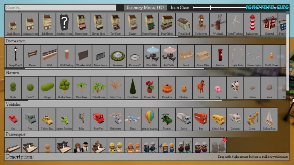 Игровой процесс разделен на несколько ключевых аспектов. Важнейшим из них является строительство железной дороги. В вашем распоряжении будет множество разнообразных элементов, позволяющих создать «деревянную» железную дорогу, что добавляет игре своеобразный шарм. Второй этап заключается в создании окружающего мира, заполненного элементами ландшафта, пассажирами, реками, горами и прочим. Вам предстоит обустраивать города, строить железнодорожные станции, остановки, дороги и многое другое. Когда все будет готово, вы сможете отправиться в увлекательное путешествие по созданному миру, собирая пассажиров и останавливаясь на станциях.