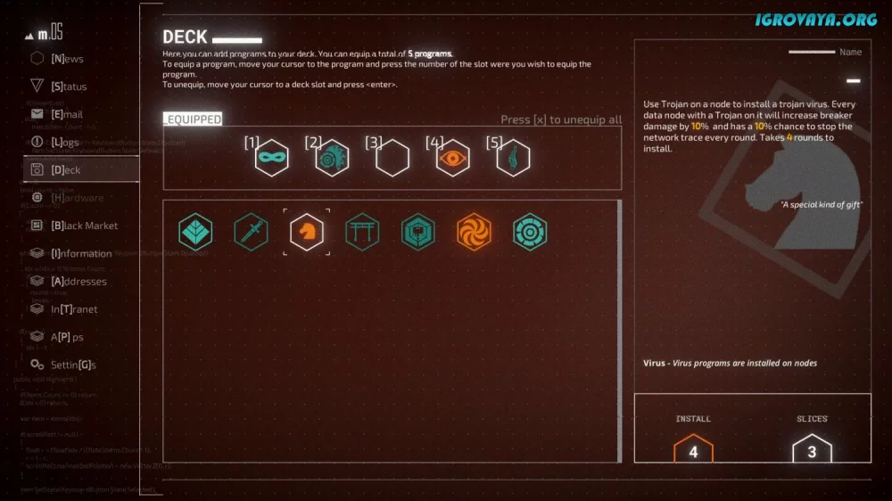 Помимо этого, вам нужно будет улучшать свои навыки, приобретая новое программное обеспечение для хакеров, выполняя различные задания и получая улучшения. Вам предстоит стать настоящим хакером, выполняя миссии, выявляя предателей, проводя взломы и принимая решения, которые повлияют на ход событий.