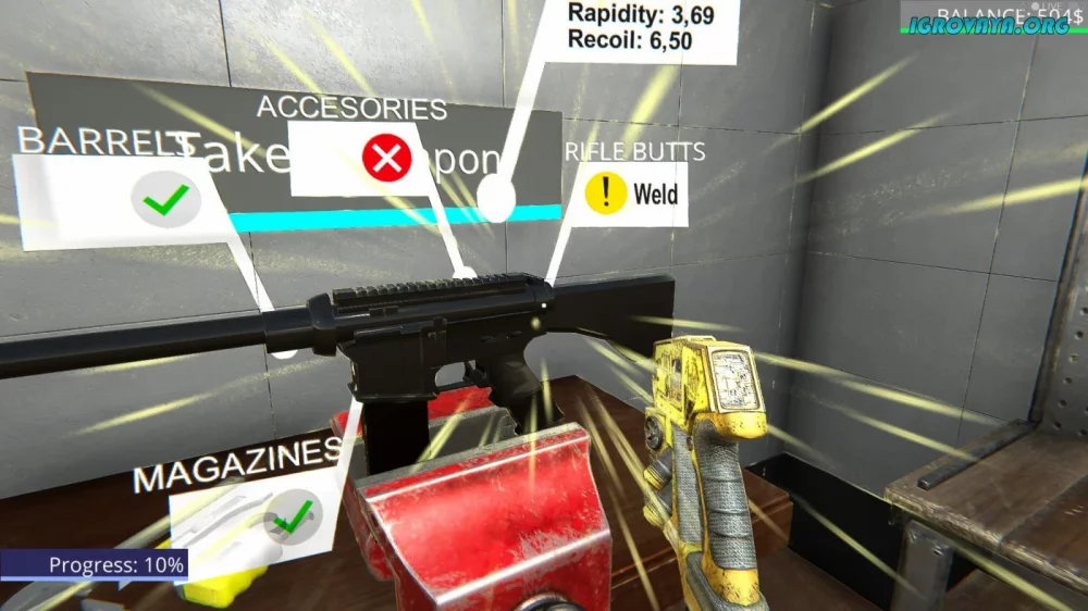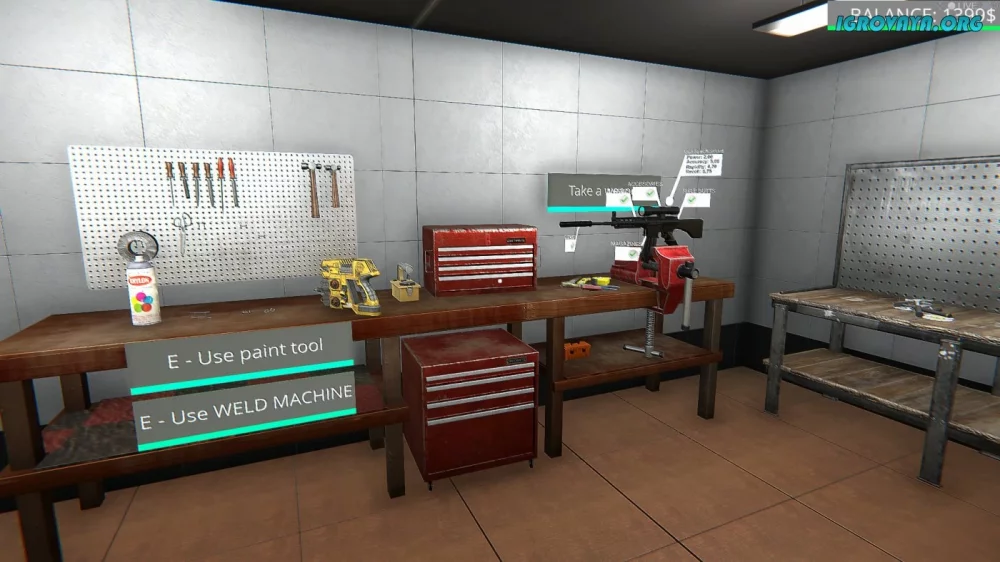 - Игровой процесс разворачивается в специальном помещении, где доступны все необходимые инструменты и материалы для создания оружия.