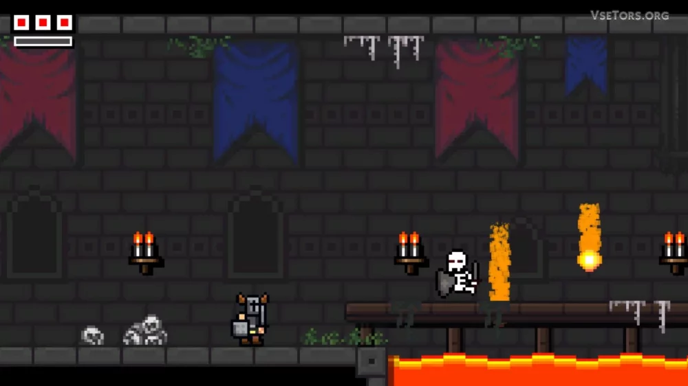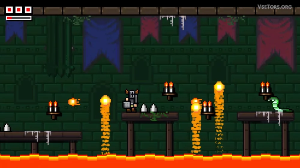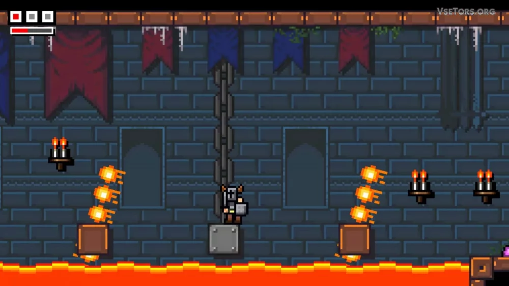 Управление в игре несложное, но требует определенного мастерства, особенно на более сложных уровнях. Прыжки по платформам над лавой, просчет таймингов и уклонение от ловушек – все это станет вашими ежедневными испытаниями на пути к победе в Horned Knight.