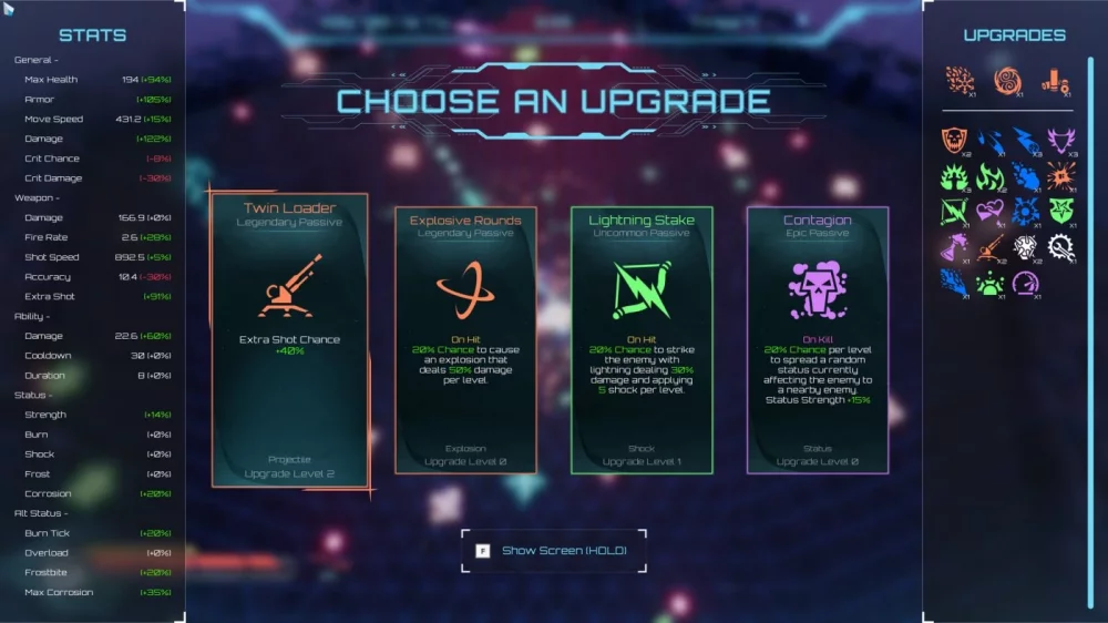 - Возможность выбора одного из трех улучшений после каждой волны противников.