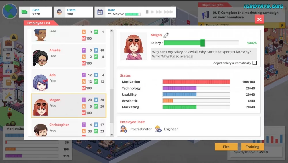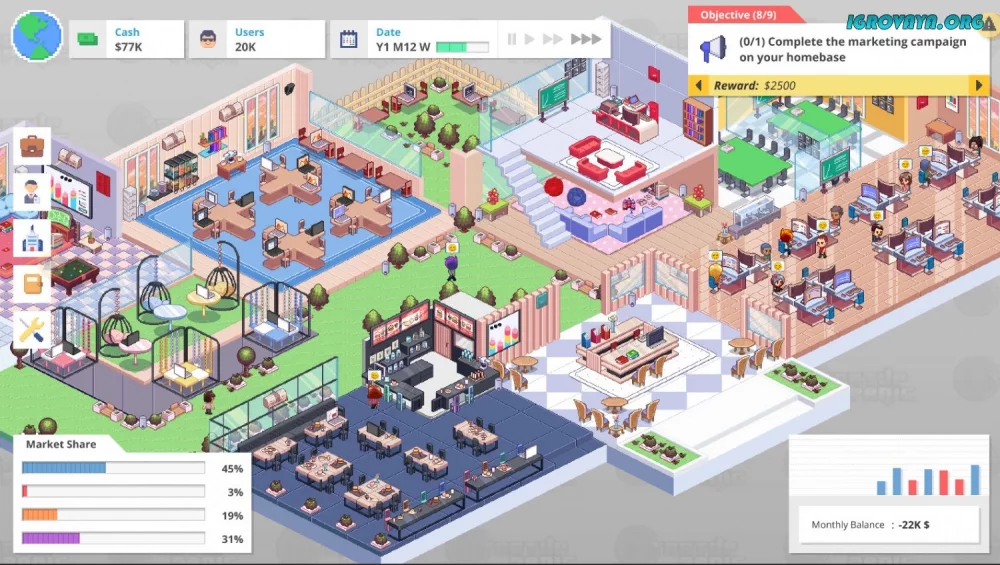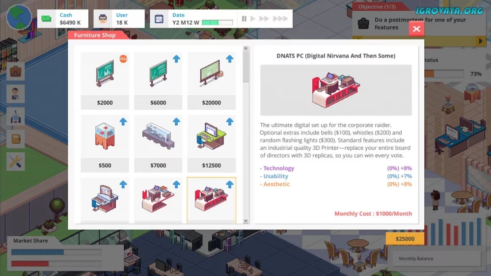 Первые заказы придут не так уж быстро, но каждое успешно выполненное задание приблизит вас к большим деньгам и новым возможностям. Расширяйте клиентскую базу, разрабатывайте все более сложные программы и постепенно меняйте свое звание сразу сотрудника на владельца.